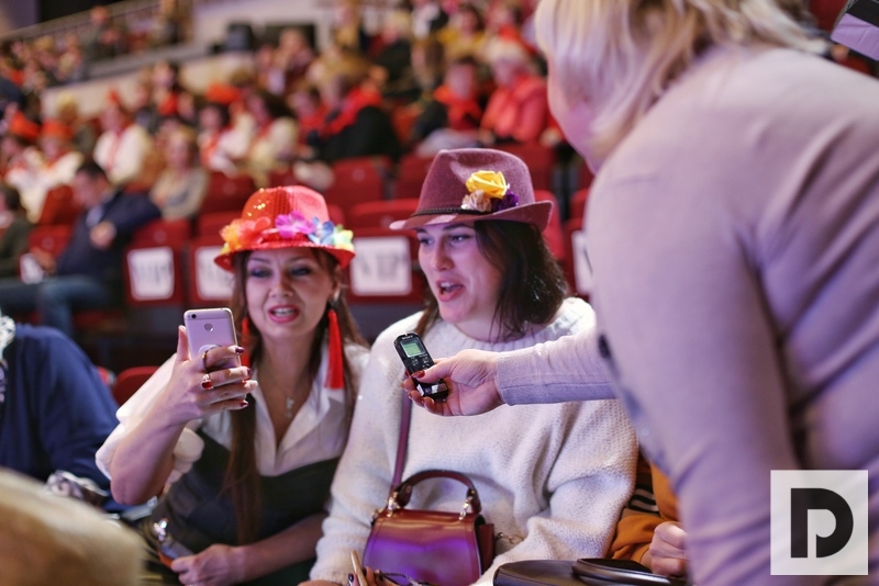 Группы поддержки команд разминались перед началом игры. Они репетировали кричалки, размахивали шарами, флагами, плакатами. Подруги Ирина и Валентина живут в Бирюлево Восточном. Они приехали на КВН, чтобы поболеть за команду своего округа и поддержать маму Валентины. Девушки поделились своими впечатлениями от КВН: «Настроение у нас шикарное. Мы уже натанцевались, ждем выступления нашей команды. Будем болеть, поддерживать их. А пока репетируем кричалки: «Южный округ пошутил и всех судий покорил!»