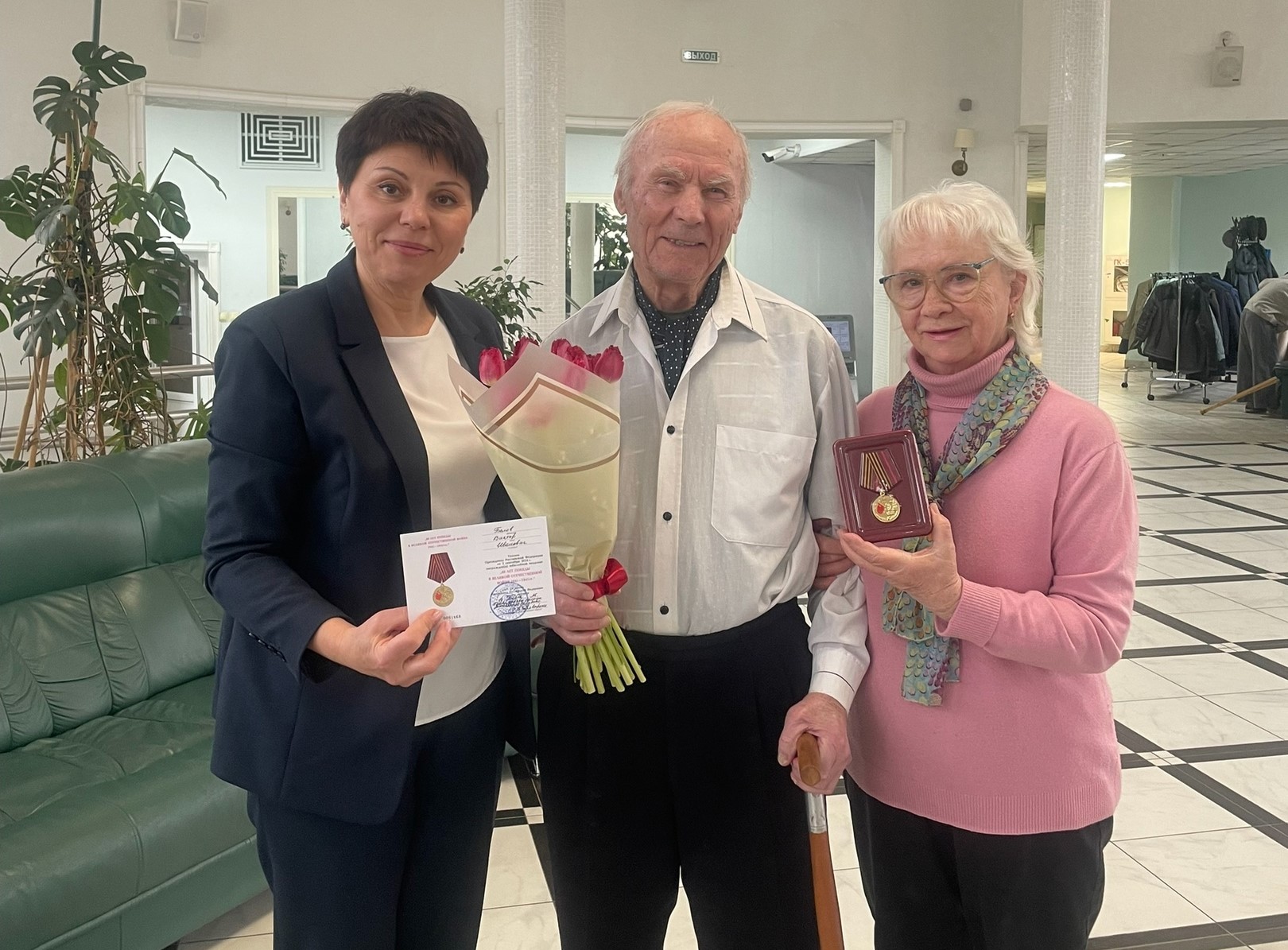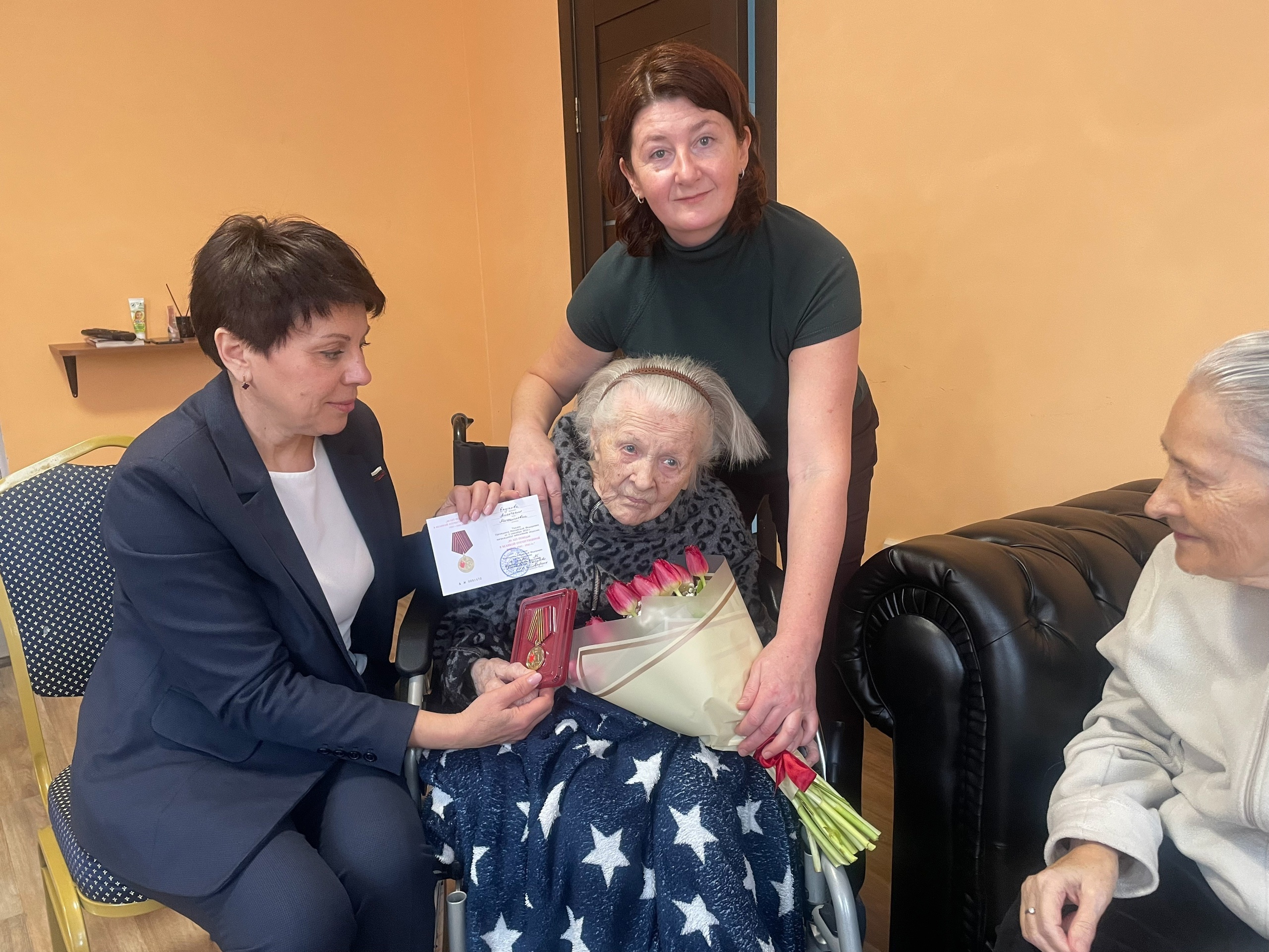В этот день Наталья Заусаева вручила медали и яркие букеты весенних цветов Анастасии Михайловне Егуповой — участнику Великой Отечественной войны и труженикам тыла — Виктору Ивановичу Белову и Софии Федоровне Махлаевой.