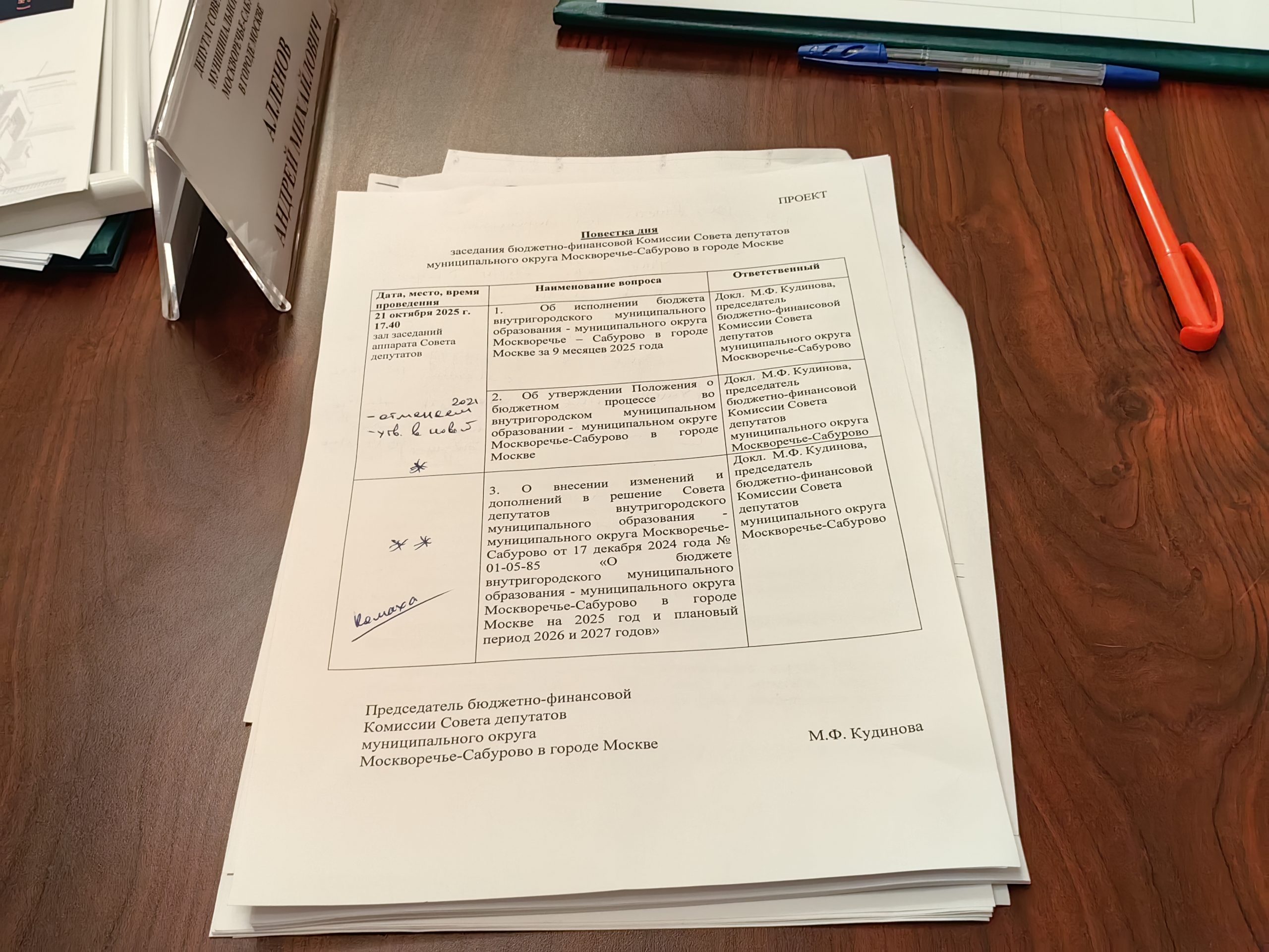 Заседание бюджетно-финансовой комиссии Совета депутатов муниципального округа Москворечье-Сабурово состоялось 21 октября. На нем присутствовала глава МО Наталья Заусаева. Рабочее собрание вел заместитель председателя бюджетно-финансовой комиссии Андрей Абертасов. Он докладывал по всем трем вопросам повестки дня.