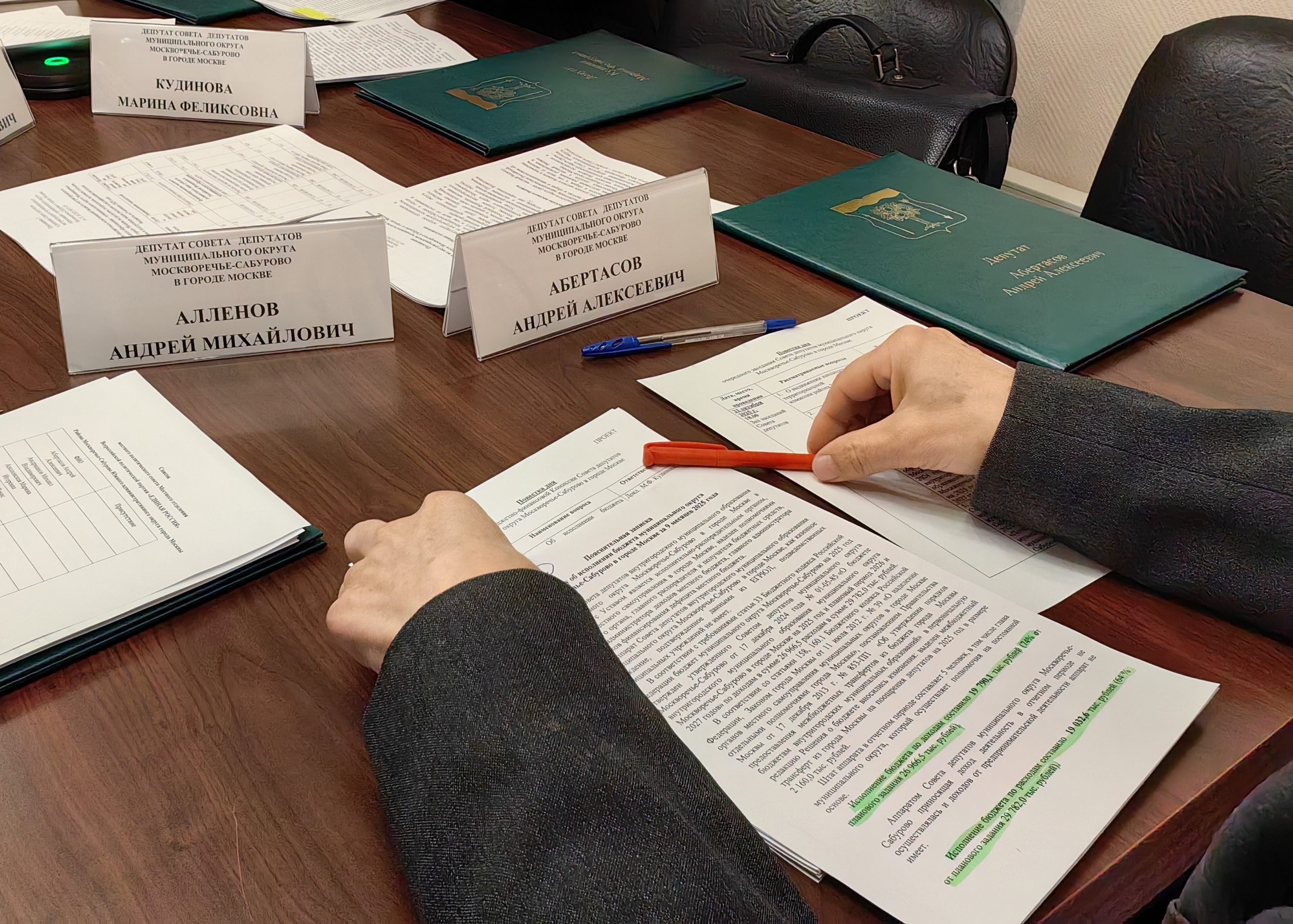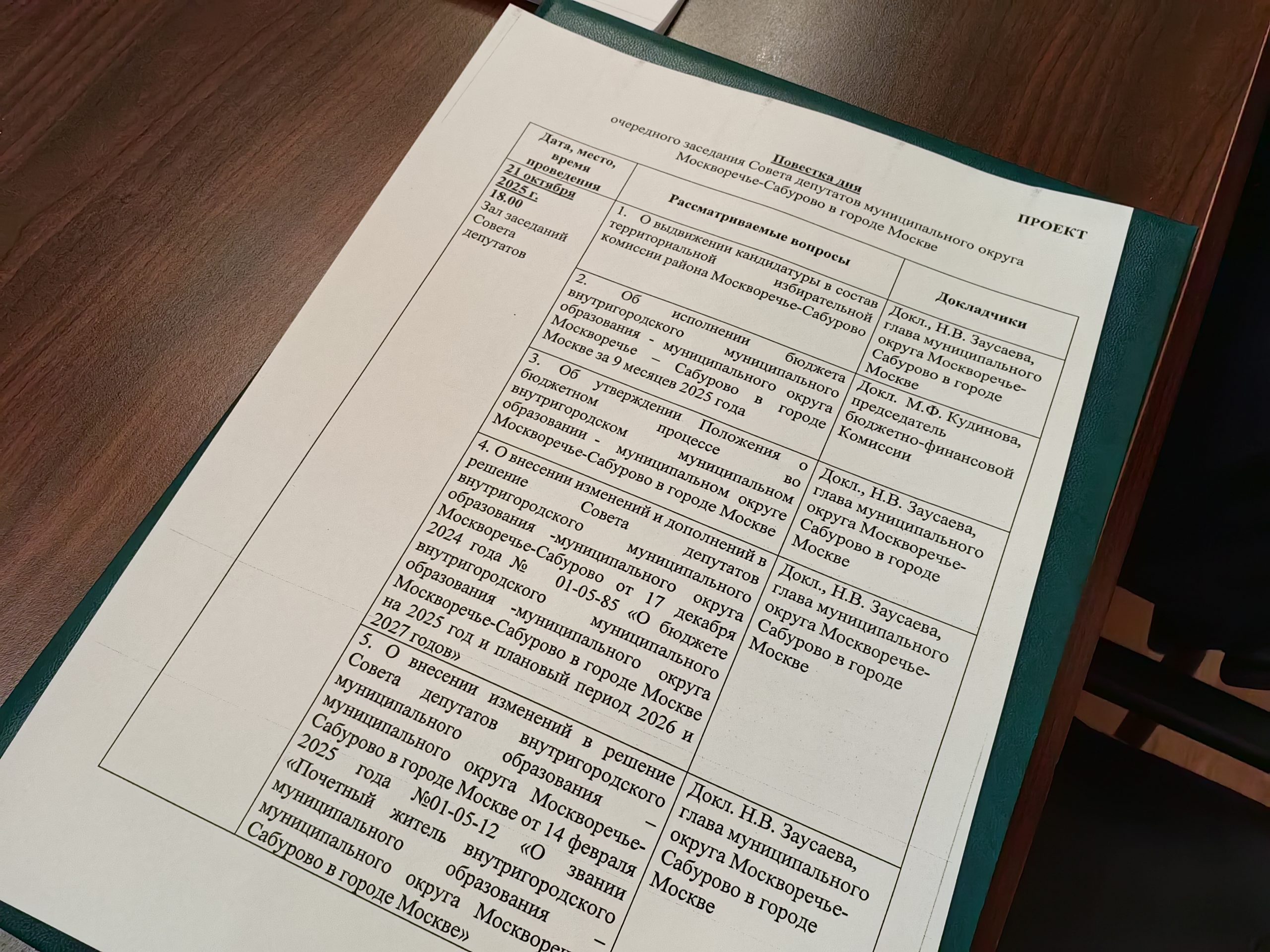 Заслушав информацию Натальи Заусаевой, парламентарии выдвинули в состав территориальной избирательной комиссии района Москворечье-Сабурово с правом решающего голоса кандидатуру Елены Зуйковой, проживающую на территории района. Далее они приняли к сведению исполнение бюджета муниципального округа Москворечье-Сабурово за 9 месяцев 2025 года по доходам в сумме — 19 790,1 тысячи рублей, по расходам в сумме —19 032,6 тысячи рублей с превышением расходов над доходами в сумме — 757,4 тысячи рублей (дефицит бюджета).