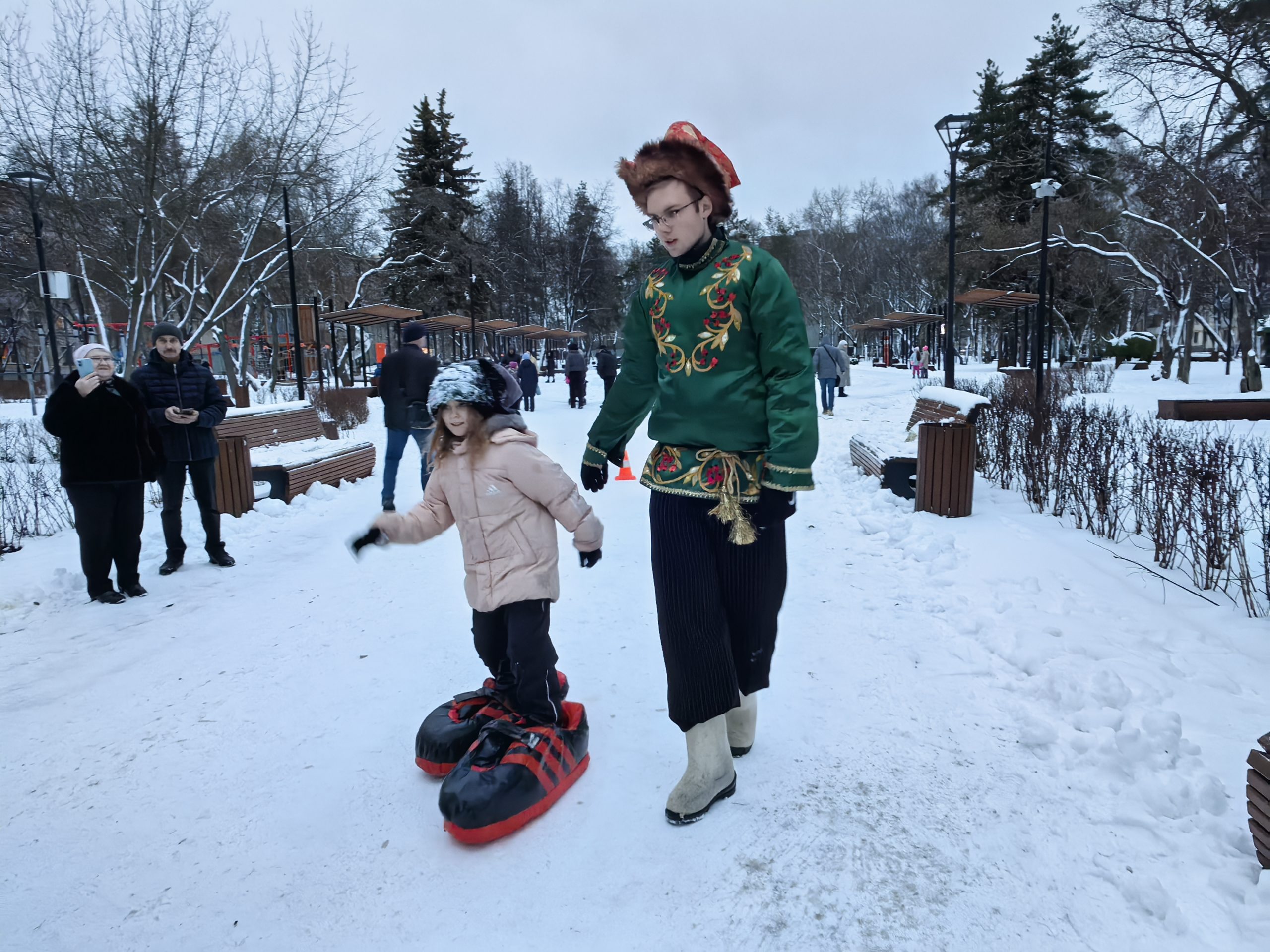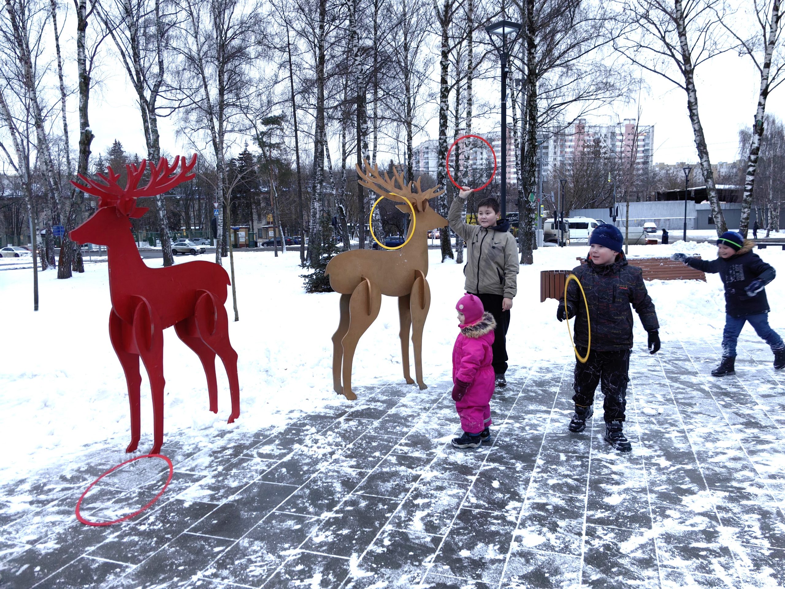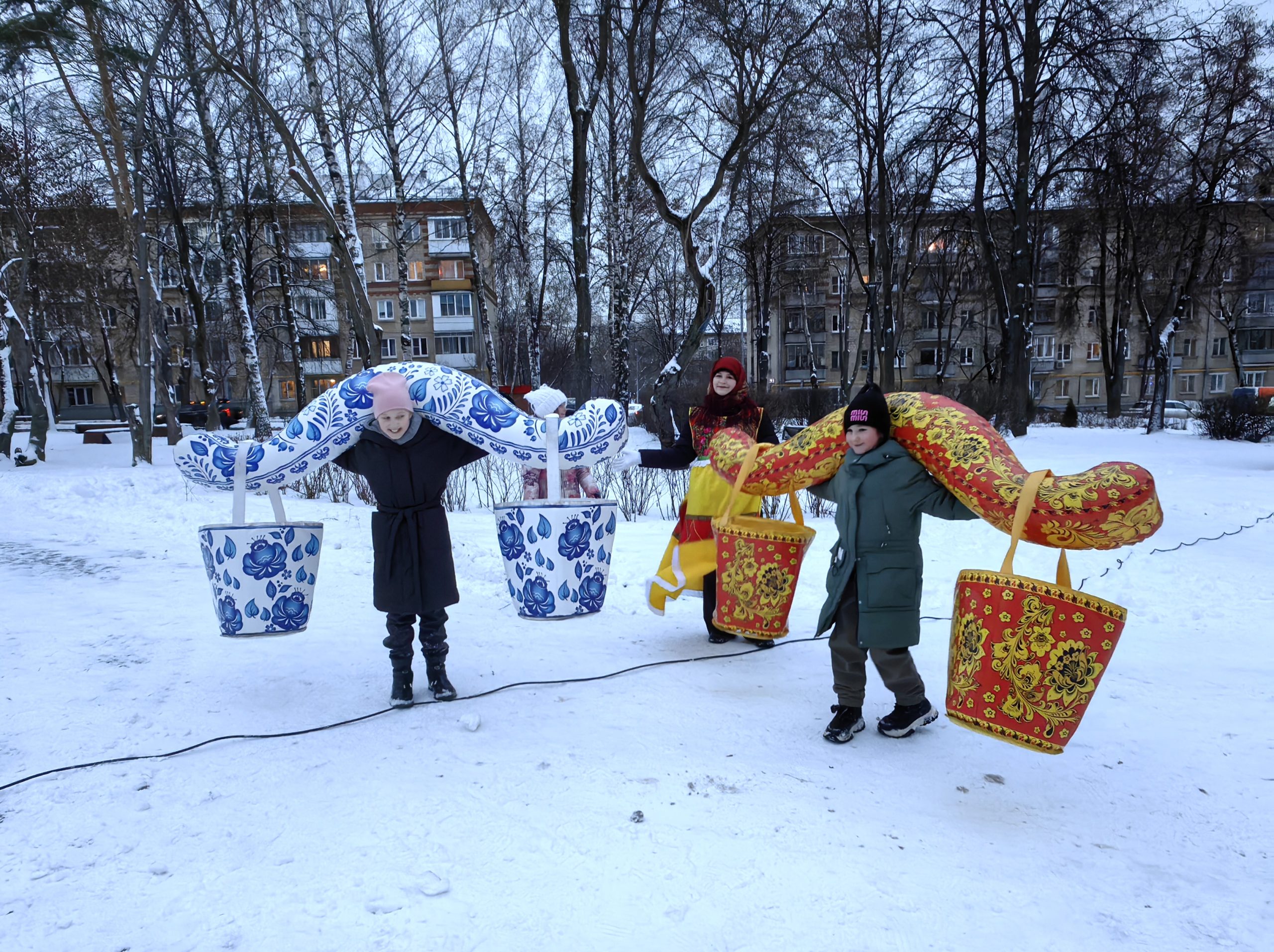 Аниматоры для юных жителей провели подвижные игры — ребята бросали кольца на рога деревянных оленей, ходили в гигантских ботинках и носили на плечах расписные под гжель и хохлому надувные коромысла.