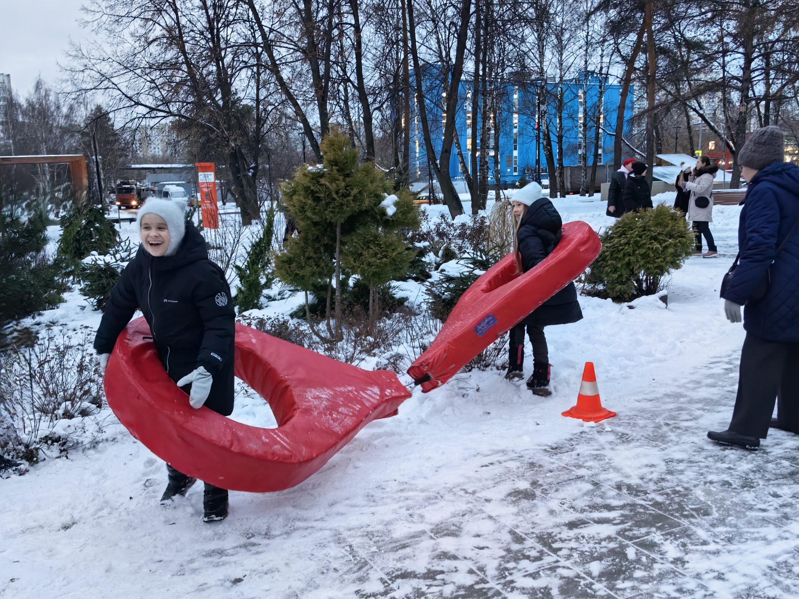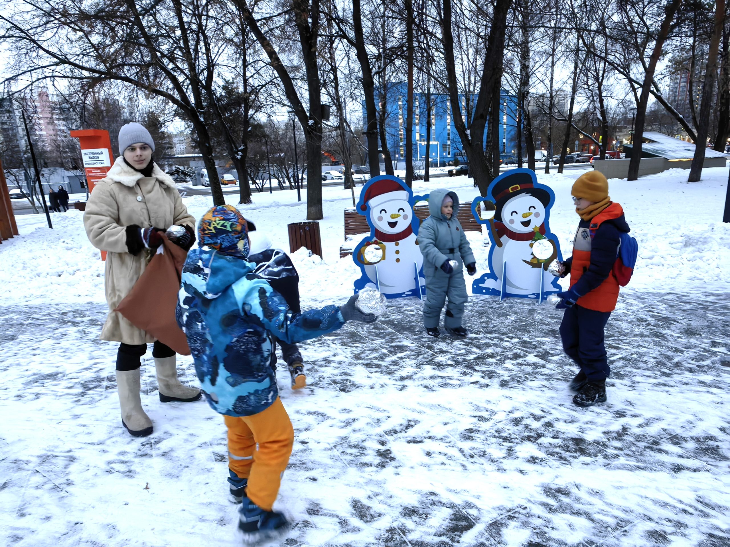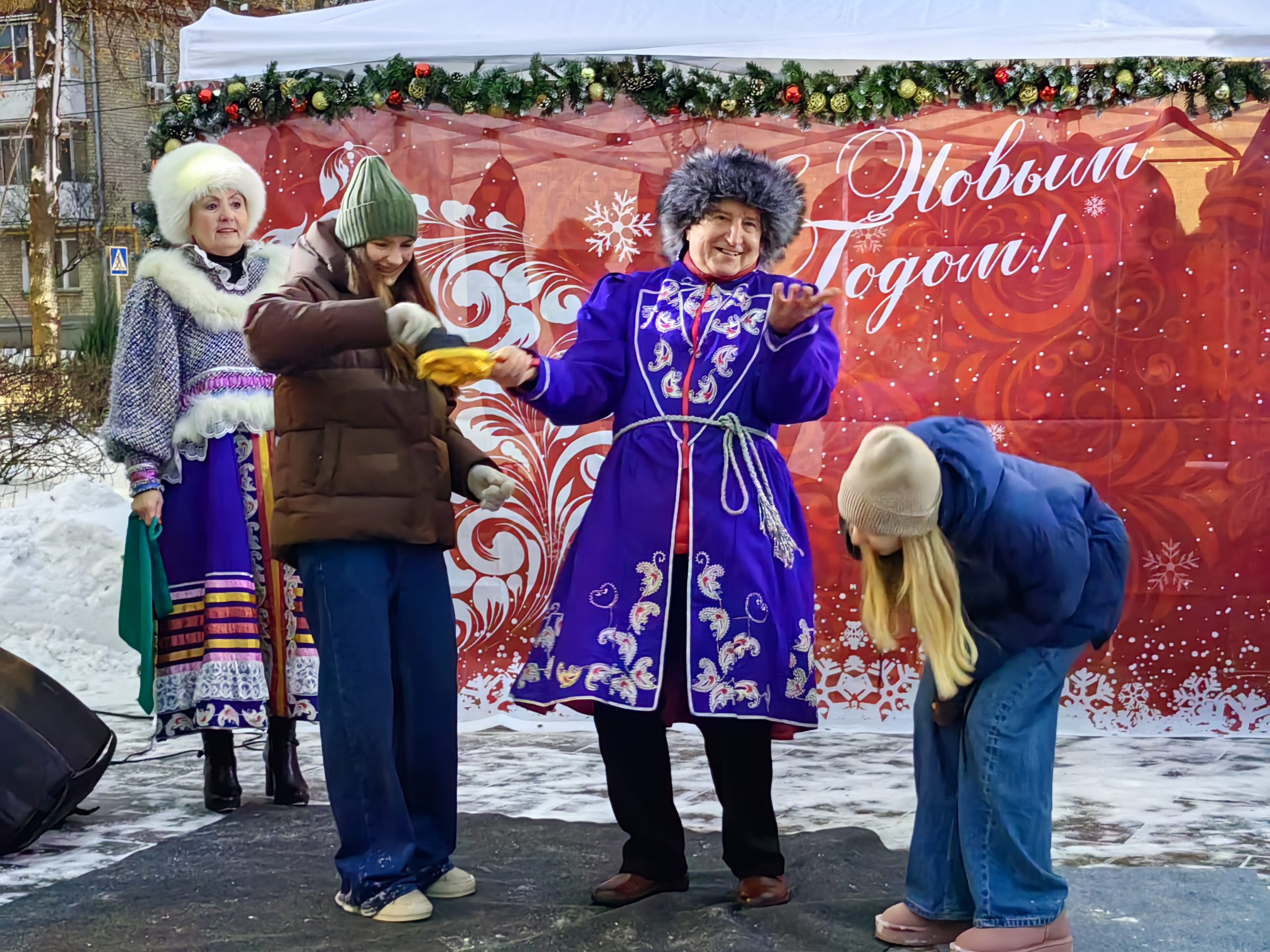 Аниматоры для юных жителей провели подвижные игры — ребята бросали кольца на рога деревянных оленей, ходили в гигантских ботинках и носили на плечах расписные под гжель и хохлому надувные коромысла.