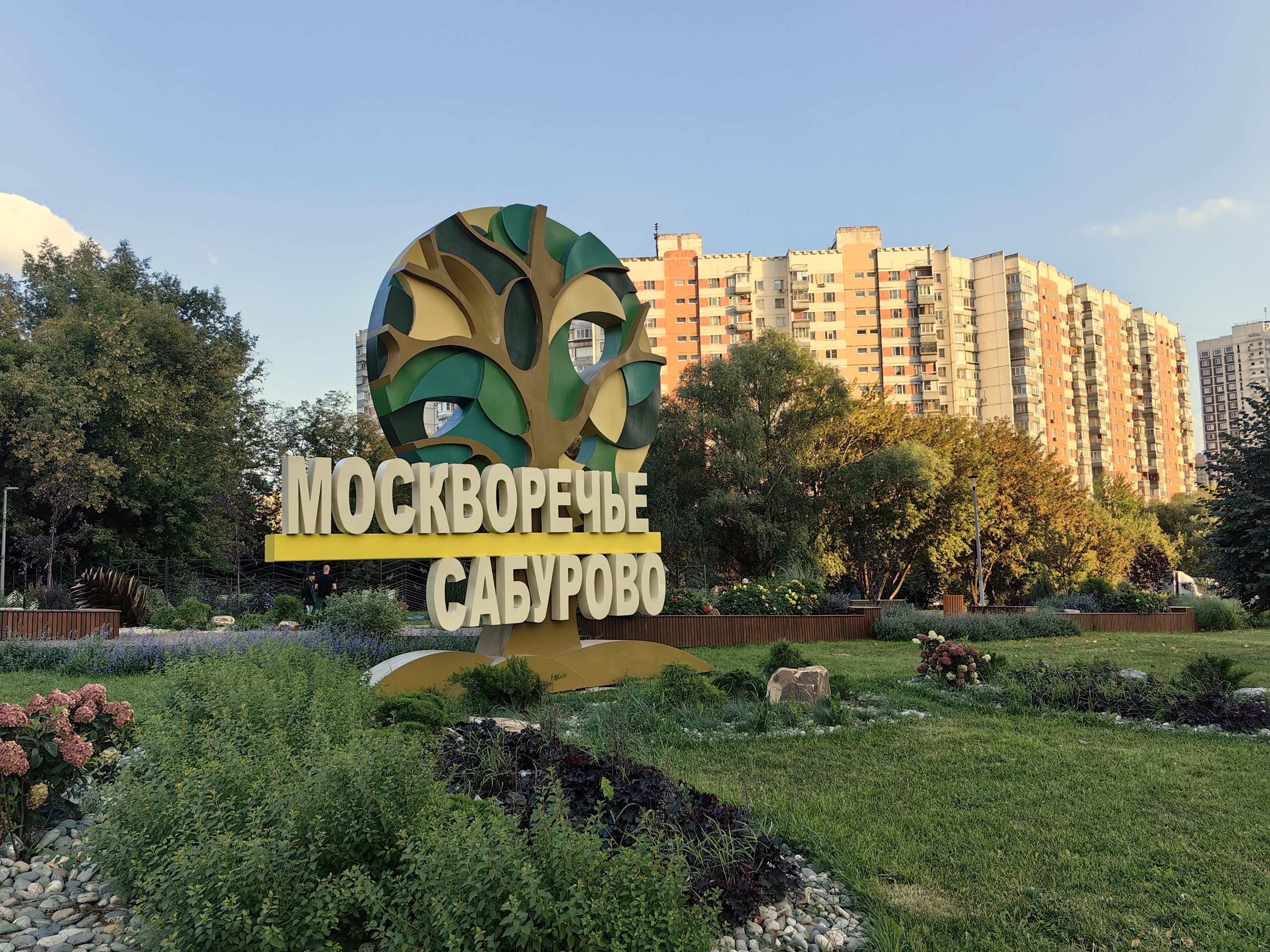 Название района Москворечье-Сабурово представлено среди деревьев и цветов — фоторепортаж